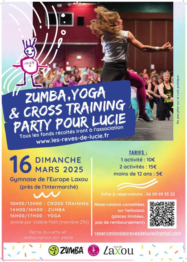 Infos et réservations (conseillées) : reservationslesrevesdelucie@gmail.com / 06 09 69 35 22 / https://www.helloasso.com/associations/les-reves-de-lucie/evenements/cross-training-et-zumba-yoga