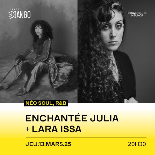 Entre chanson, soul et RnB, voici un nuage de douceur et de groove raffiné. Après avoir multiplié les collaborations avec la scène hip hop française, Enchantée Julia lâche un album intime et somptueux : « Onze ». L’artiste nous invite à naviguer dans un univers neo soul qui marie avec brio le lyrisme hérité de la chanson avec les codes rythmiques et mélodiques d’une soul contemporaine aux racines anglo-saxonnes. Dans ce registre, les projecteurs strasbourgeois sont braqués sur l’incroyable voix de Lara Issa, architecte de la scène jazz soul house locale depuis plusieurs années. Son groupe éponyme émerge avec assurance dans le paysage et captive un public au-delà des frontières. Django est fier d’accompagner Lara Issa cette année dans le cadre de l’opération transfrontalière Iceberg, et vous prescrit cette dose de volupté, dansante et émouvante.