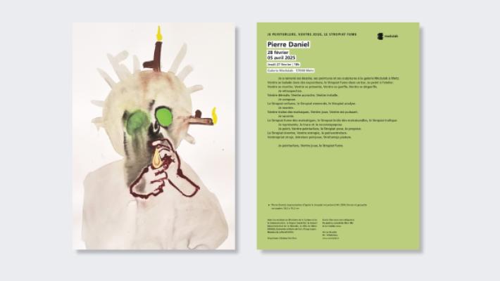 La pratique de Pierre Daniel se déploie sous la forme de dessins, de sculptures, de peintures, d’installations, de poésies et de performances. Il traite des questions liées au colonialisme, à la violence sociale et aux excès du capitalisme. Teinté d’un humour acide, il développe un univers qui défie le bon goût et convoque le satirique, le trivial et le monstrueux, pour mieux pousser le spectateur dans ses derniers retranchements.