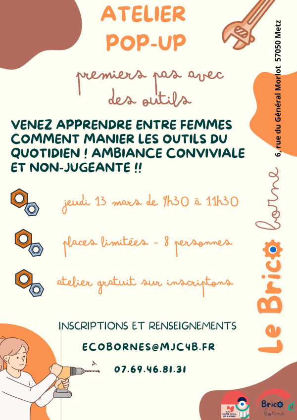 Mesdames, venez participer à notre deuxième atelier "Premiers pas avec des outils" le ?e?d? ?3 M?r? !!