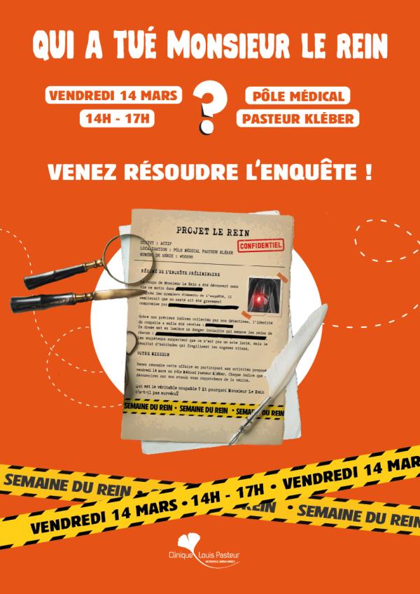 Pour résoudre cette énigme, collectez des indices sur les différents stands et échangez avec des professionnels de santé (infirmiers, diététiciennes, enseignant en activité physique adaptée, tabacologue) qui vous donneront de précieux conseils pour préserver votre santé rénale. Sur place, vous pourrez bénéficier d’un dépistage proposé par France Rein.
